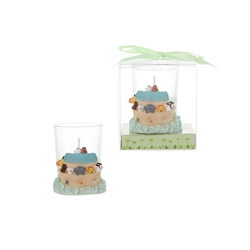A variety of animals riding on Noah's Ark with a white candle in a glass